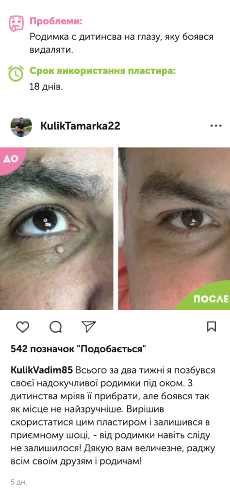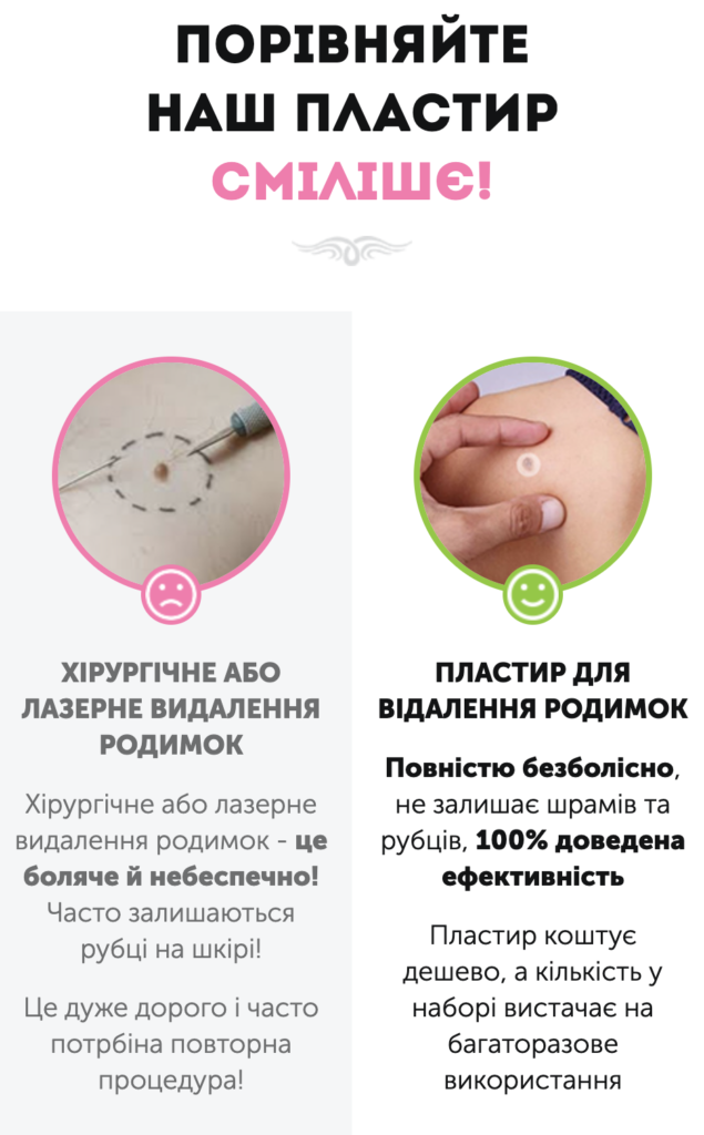 Пластир для видалення родимок — містить гідроколоїдну формулу, яка глибоко проникає в родимки та бородавки на шкірі. Пластир працює, стискаючи та висушуючи родимки/бородавку доти, доки вона не відпаде природним чином